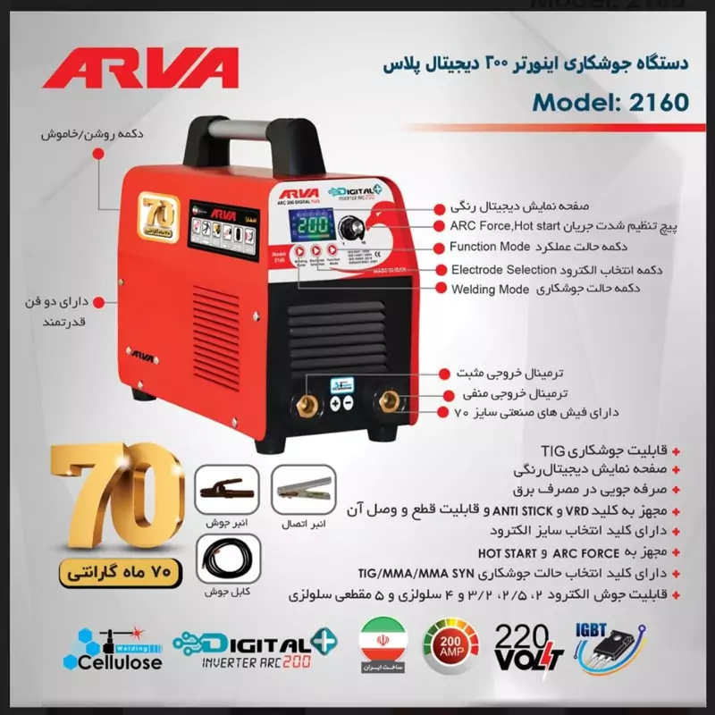 اینورتر دستگاه جوش 200 آمپر آروا مدل 2160 سلولوزی و 70 ماه گارانتی بی قید و شرط arva (ارسال از ابزار حسین 24)